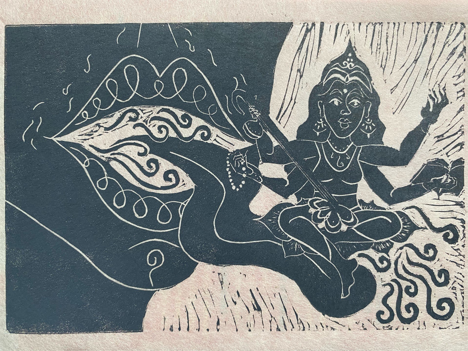 It is said that those who are intelligent, articulate, well-spoken, thoughtful, carry Saraswati on their tongue. Speech, indeed, is what transmutes thought into creation.